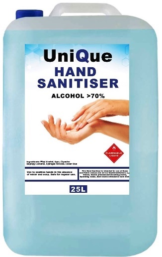 • Description Casey UniQue HanPro 25 Litre Hand and Surface Alcohol Based Sanitiser Liquid –Light Blue